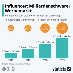Übrigens erreicht der Werbemarkt für Influenzer – das sogenannte Influencer Marketing – in 2019 ein Volumen von 6,5 Milliarden US-Dollar weltweit.