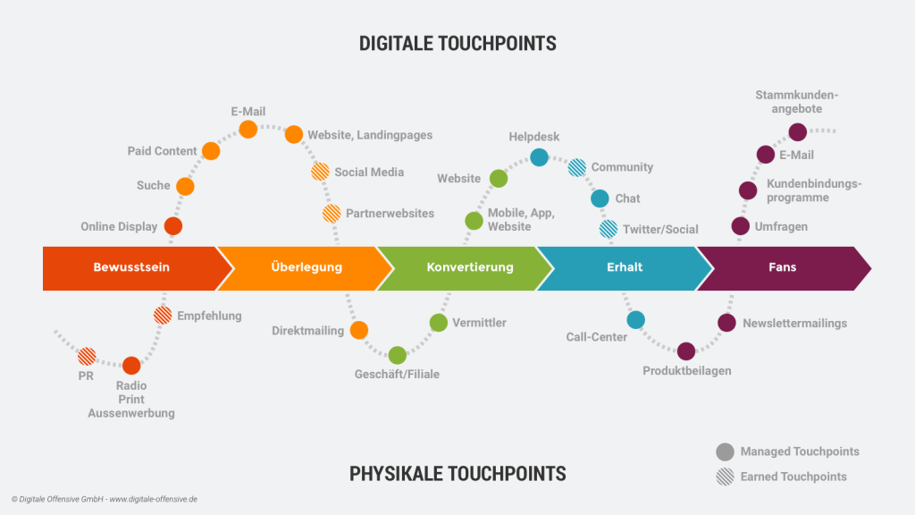 Die Customer Journey ist die Kombination aus den Möglichkeiten und den eigenen Präferenzen. Bezogen auf die Reise der Kunden:innen kann grob in Digitale Touchpoint und Analoge Touchpoints differenziert werden. Wer die Angebote wie nutzt, ist abhängig von den eigenen Vorlieben und dem Mediennutzungsverhalten. Das wiederum ist abhängig davon, was für eine „Persona“ ich bin.